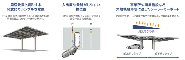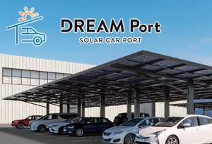 【外観】 | 「DREAM Port」は、事業所や商業施設、工場などの建物の景観に溶け込むデザインを採用したソーラーカーポートです。 |