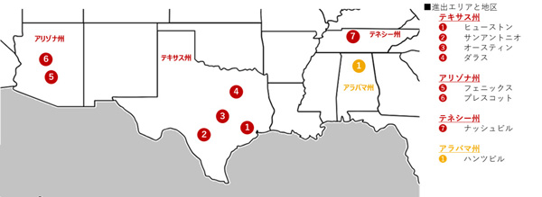 大和ハウスグループでは、地域の気候や文化などに配慮した地域密著型の事業を展開することで、米國での進出地域の拡大を進めています。戸建住宅事業では、現地法人である大和ハウスグループ3社(スタンレー?マーチン社、キャッスルロック社、トゥルーマーク社)が、米國の東部、南部、西部を結ぶスマイルゾーンを中心に事業を進めており、各地域での戸建住宅會社のM&Aなどで営業?施工體制を整備しながらエリアの拡大を図っています。
