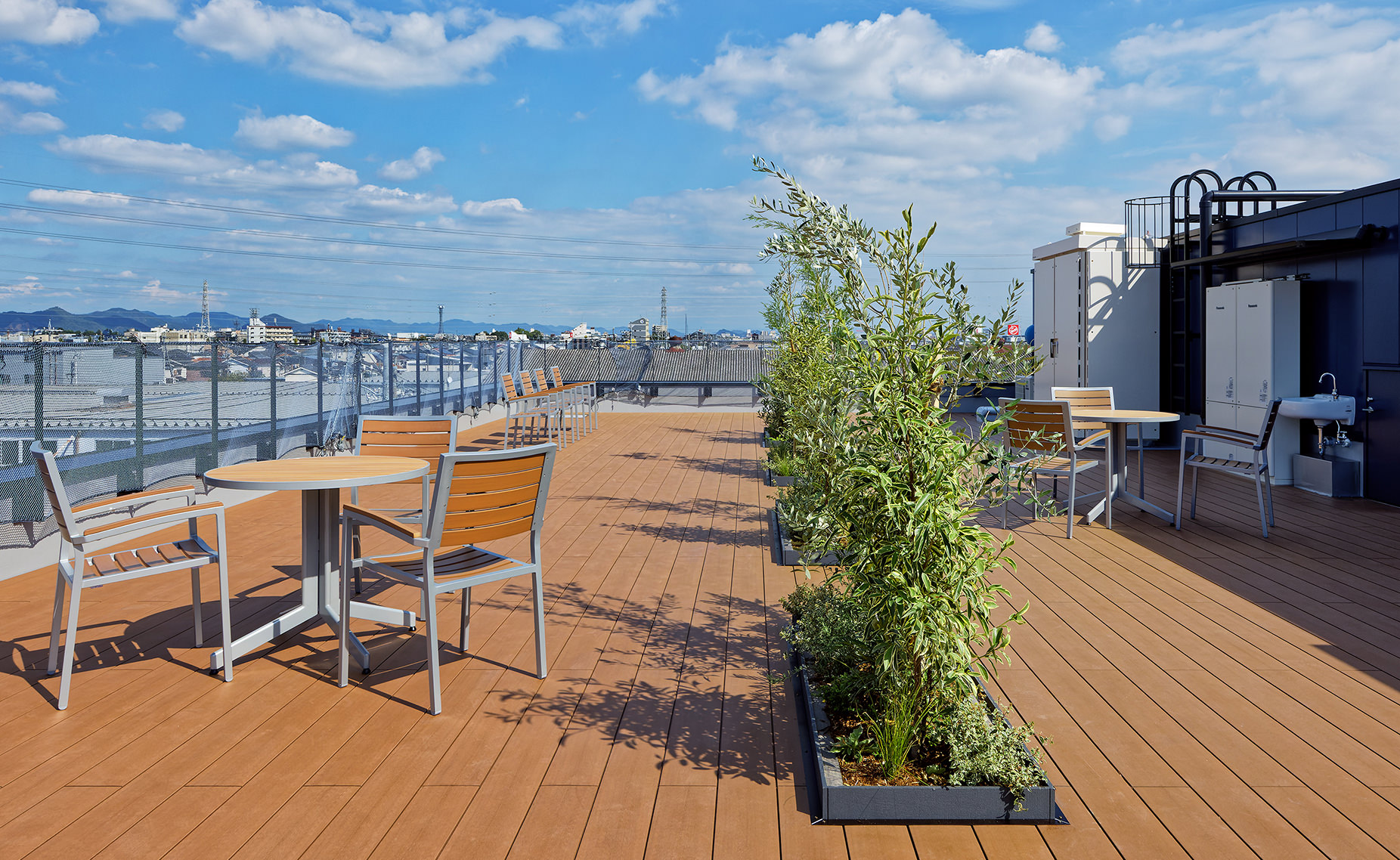 敷地は國道沿いであるため、國道側にインパクトを與えるよう、空気?熱の流れをイメージしたデザインとしました。また、來訪者への技術アピールや社員教育のため、內部空間は天井スケルトンとし、設備機器や鉄骨構造を魅せるデザインとしています。