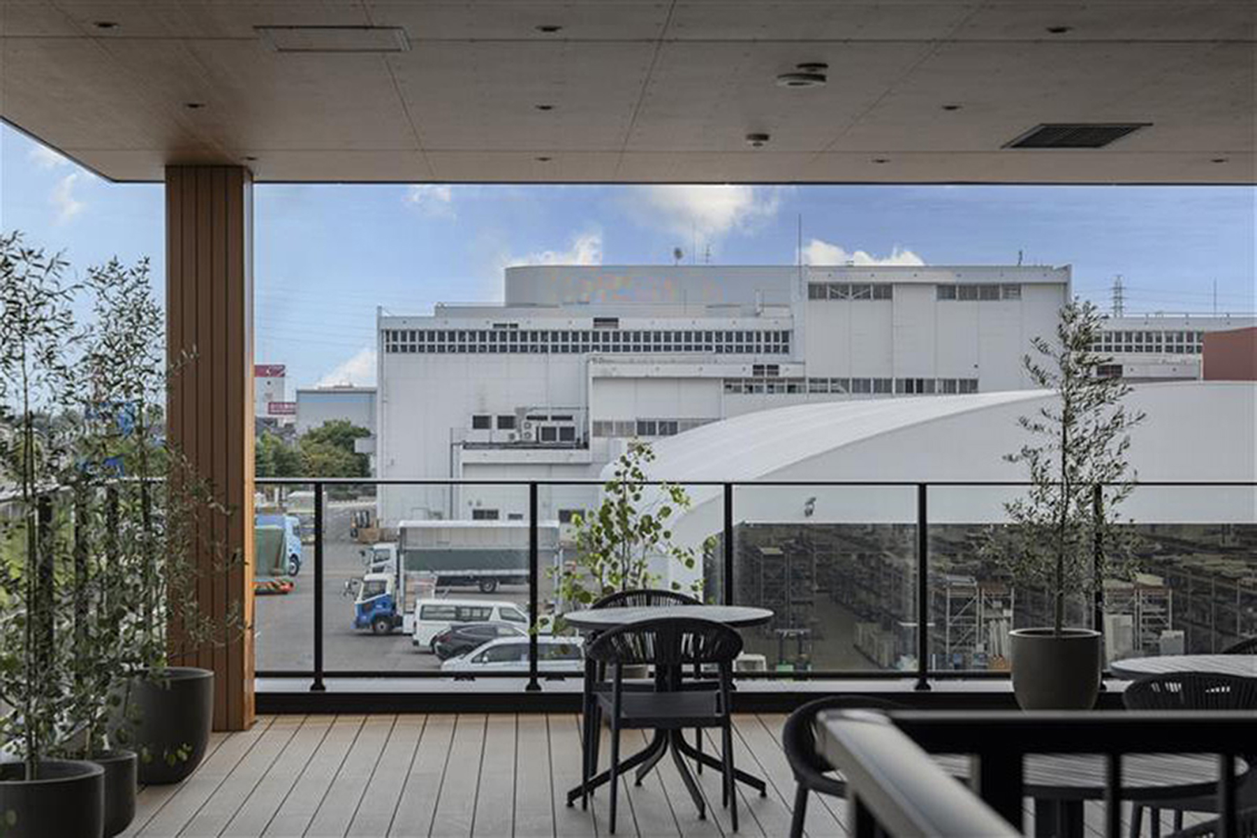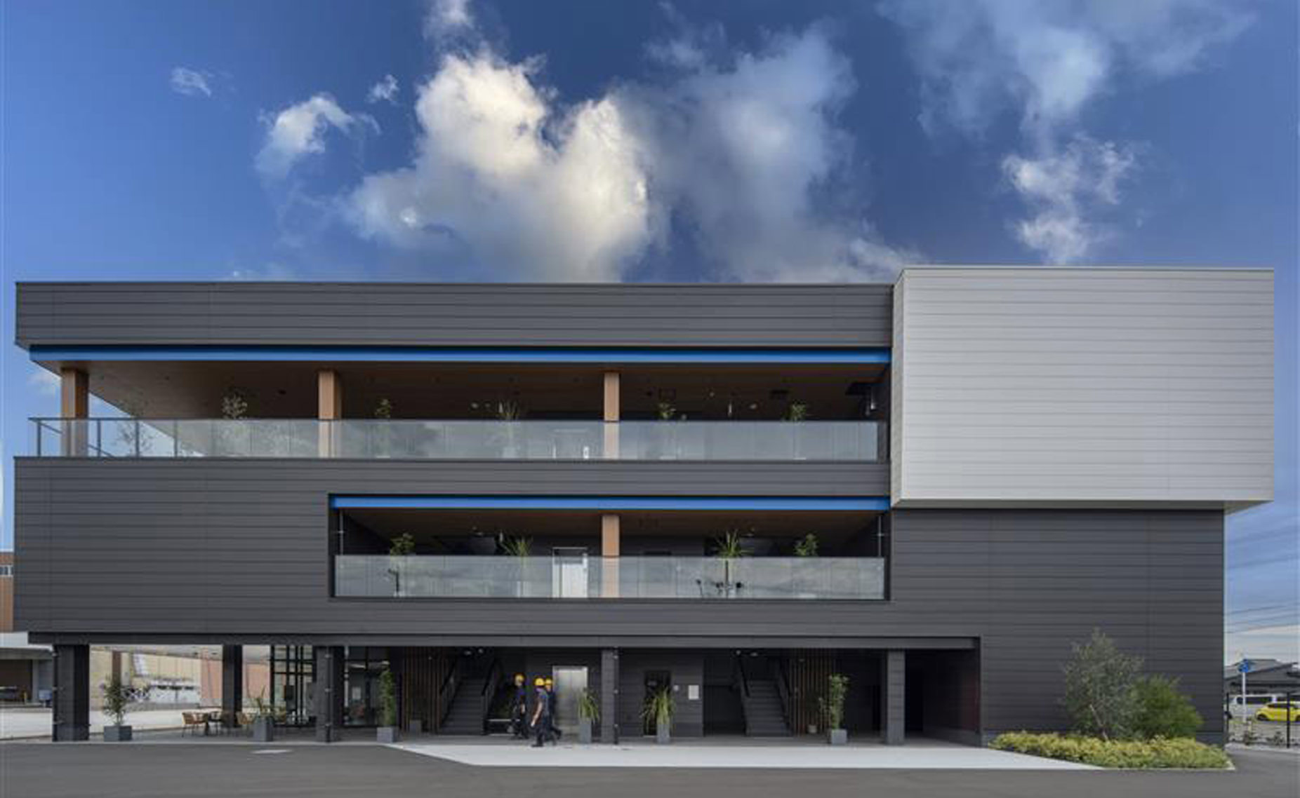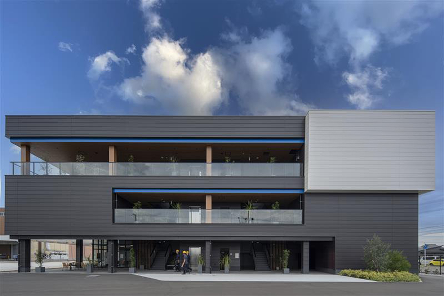 本プロジェクトは、工作機械メーカー本社工場のロッカー施設整備計畫です。毎日500名近くの従業員が利用するこの施設は、著替えるだけではなく『コミュニケーションが生まれる場』をつくる事をコンセプトにテラスを計畫しました。このテラスは、各階に設けられそれぞれの階で目的を分けています。1階はバスの待合所として扱われ、3階では研修前後のリフレッシュスペースとしても機能しています。工場敷地內の北東角に計畫した厚生棟は、隣接する工場棟とファサードデザインの差別化を図り、テラスでの賑わいと共に今後工場が変わっていく事を周辺へ発信しています。