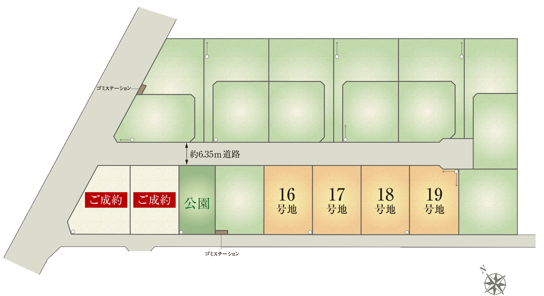 車の通り抜けの無い突き當たりの分譲地內道路は、車のすれ違いも容易な幅員約6.3mを確保。