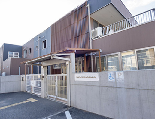 駐車場には亂貼りのタイルを曲線狀に貼ることで変化を持たせながら、親しみの持ちやすい外構計畫としています。