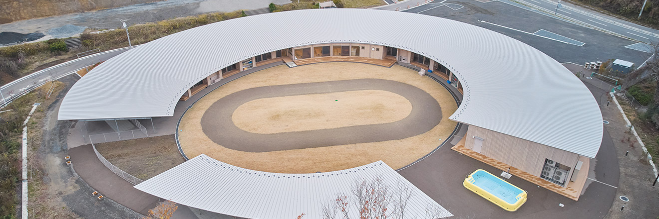 天然芝と土のトラックで構(gòu)成する園庭を囲むように、ドーナツ型の園舎を設(shè)計(jì)。