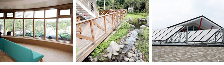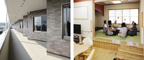 屋外には広々としたガーデンがあり、さまざまなハーブが植えられ、人工池でつくったビオトーブにはメダカが泳ぎ、夏にトンボが飛來するそうです。建物の1階の南面には広い木製のサンデッキがつづき、2階のグループホームの居室はノコギリの歯狀になっていて部屋の獨立感を高める効果をもたらしています。自宅の延長として設けられた和の空間、2階の談話室から眺める1階屋上の緑化庭園、本格的な設備を備えたカラオケルームも自慢の一つです。