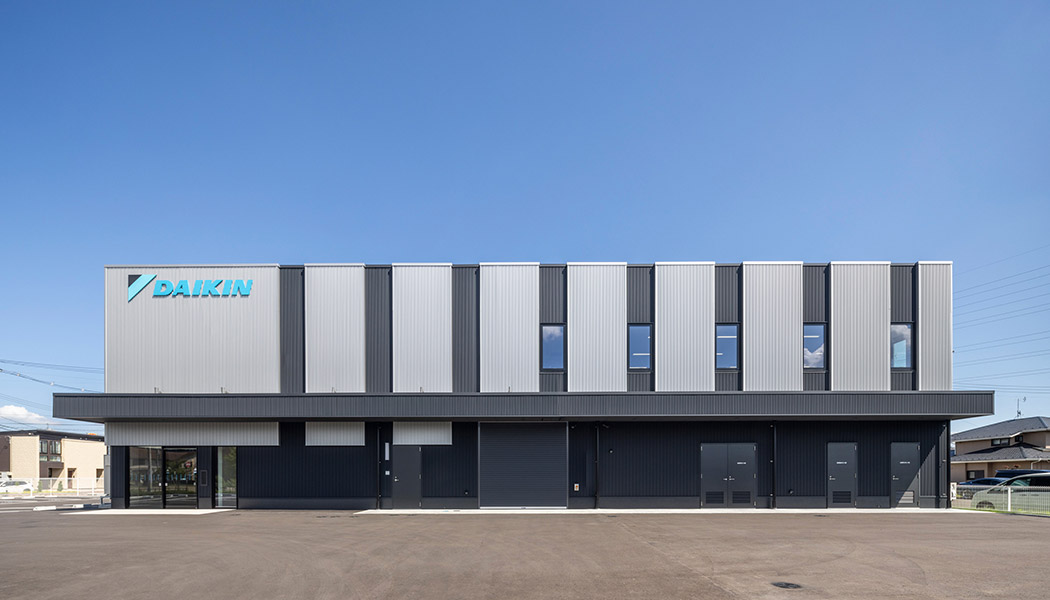 本施設は、事務所と倉庫を併設し、空調機の修理?メンテナンスを行うサービス拠點です。空調メーカーらしさを感じさせる爽やかでクリーンなデザインを、外観と內部に取り入れました。