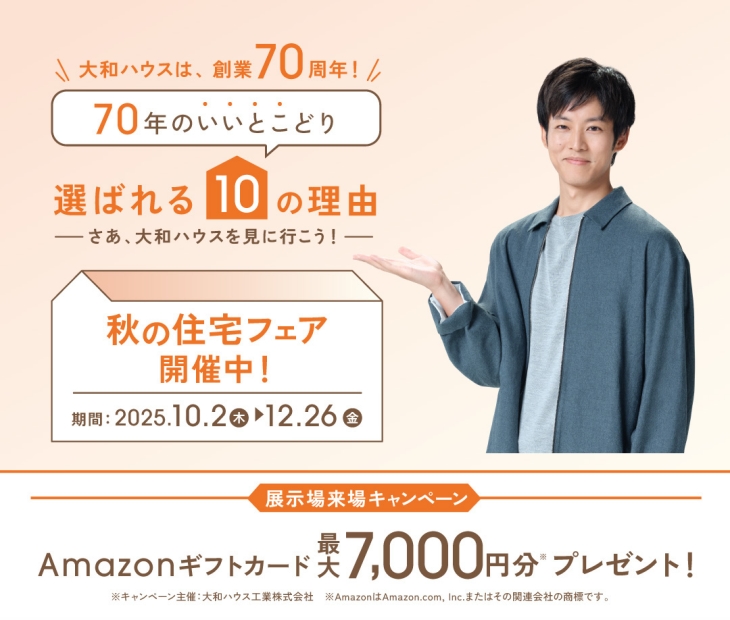 ●大和ハウスの公式WEBサイトから「住宅展示場」の来場予約を初めてご利用される方に限らせていただきます。●後日、次回の商談予約をキャンセルされた場合、「Amazon ギフトカード 3,000 円分」の景品獲得の権利は無効となります。●専用のプレゼント応募用フォームに登録していただくAmazon ギフトカード送信用の情報は、ご予約時に登録していただいた情報(氏名、電話番号、メールアドレス)と同じ内容にしてください。●1家族さま 1回限り。●未成年者のみのご来場はご遠慮ください。●プレゼントは後日お渡しとなります。●大和ハウスより、ご登録いただいたメールアドレス宛に、2026年1月末頃にプレゼント受け取り用URLをご案内する予定ですが、状況によりご案内時期が変更となる場合がございます。●メールアドレスの登録間違い、受け取り側の受信設定などが理由でメールの受け取りができない場合は、賞品獲得の権利は無効となります。受信拒否や迷惑メールフォルダに振り分けされないよう、「