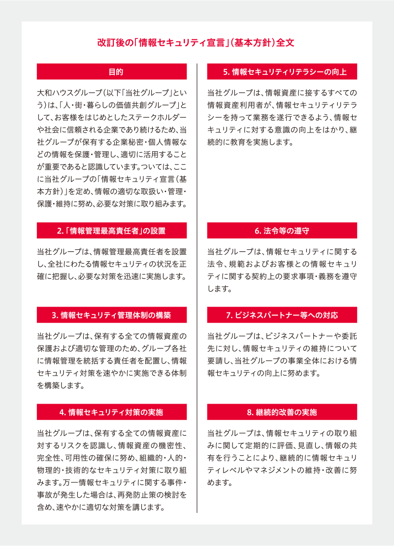 昨今の社會環境において、當社グループ會社も含めて企業內の情報をいかに統制するかは、重要な経営課題のひとつとなっています。2021年度、2022年度には既存の「情報セキュリティ宣言」(基本方針)を大幅に改定し、併せて「リスクマネジメント規程」、「情報管理規程」、「情報取り扱いマニュアル」、「グループ情報管理基本規程」などの関連規程も制定?改定を行い、情報セキュリティ基準に沿った具體的施策(IT統制規程類の運用、入口?出口対策、情報保護対策など)を実施しています。