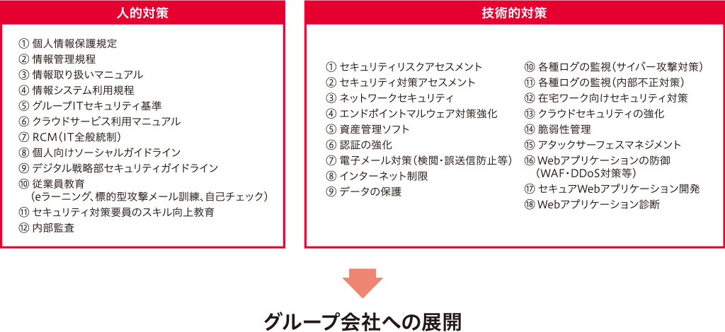 具體的には、従來より実施しているIT資産管理、エンドポイントの防御?監視?対応の強化、クラウド利用のセキュリティ対策、従業員のITリテラシー向上策(eラーニング、標的型攻撃メール訓練の定期実施等)、內部不正対策などの施策を継続して行っており、「第7次IT中期計畫」(2022~2026年度)では海外を含むグループ會社へ適用範囲を拡張して施策を実施しています。2022年度には、IT利用のルールを「情報システム利用規定」に統合し、2023年度には「グループITセキュリティ基準」を制定しグループ全體で対策レベルの底上げを実施しております。また、セキュリティ対策要員のスキル向上のための継続的な専門教育にも取り組んでいます。(図2)
