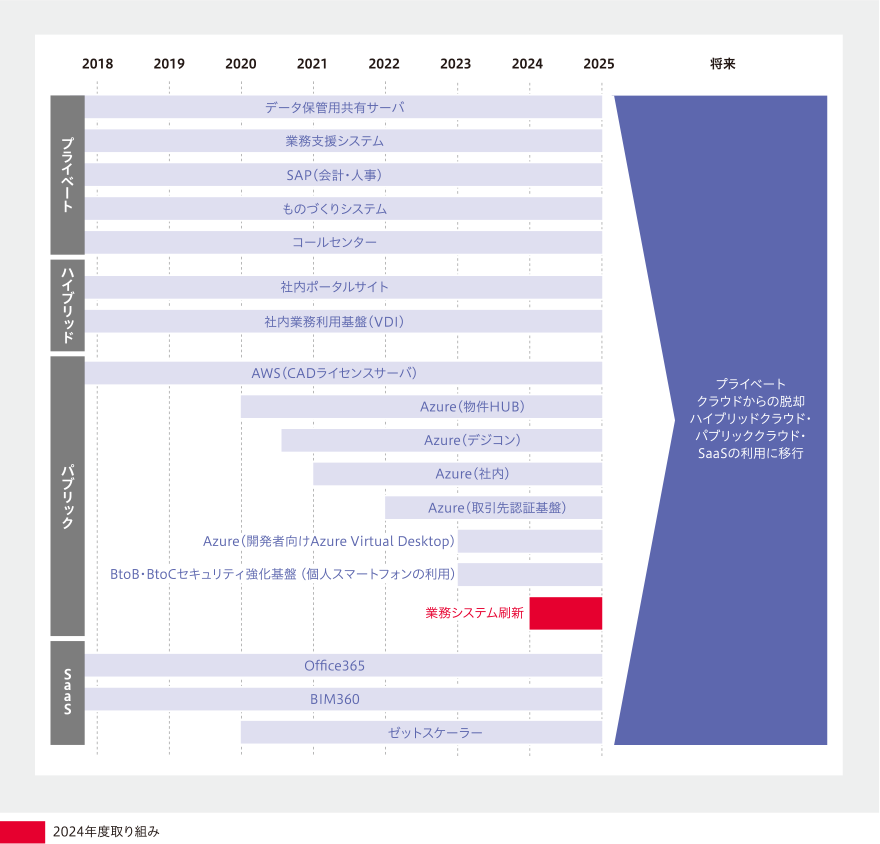 昨今の業務変革のスピードや建設DXを支えていくには、クラウドサービスをはじめ、その環境の利用を前提としたシステムとサービスを積極的に導入することが必須と考えられます。今後は、クラウドサービスやクラウド環境のメリットを最大限に享受できるよう、當社グループのクラウドネイティブ環境の構築を進めていきます。また、ネットワーク環境については「ゼットスケーラー」の導入により、いつでもどこでも安全?安心に社內接続ができる環境を整えました。インターネットを中心とした業務が増えることで、今後は大容量のファイルの受け渡しなどより一層の通信レスポンスが必要になります。ユーザの要求に応え、ユーザが満足できるインフラ基盤の環境整備を進めます。