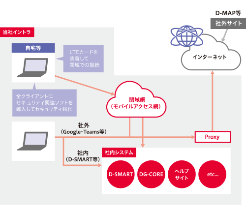 従來のモバイルアクセス環境は閉域LTEを使用した方式でしたが、「Zscaler」を導入し、自宅のインターネットや安全なWi-Fi環境から安心して社內インフラを利用できる環境を構築しました。(図3)(図4)