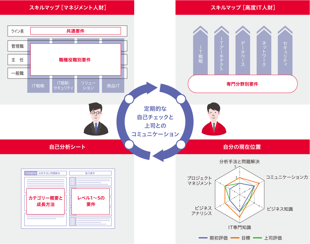 ガイドラインにおいては、マネジメント人財と高度IT人財のそれぞれに求められる能力をスキルマップとして明確化しました。そして、自己分析シートを活用して自分の現(xiàn)在位置を定期的に確認(rèn)し、今後の成長?育成について上司とコミュニケーションをとっています。(図1)
