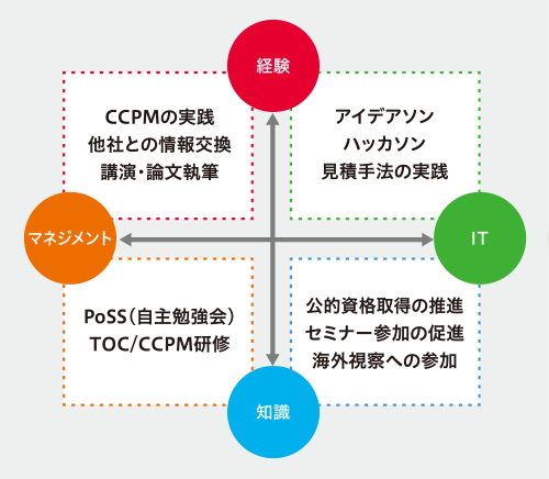 デジタル戦略部門では、ゼネラリストとしてのマネジメント人財と、スペシャリストとしての高度IT人財の両方が必要です。マネジメント人財として能力の幅と深さをバランスよく成長させるか、高度IT人財として技術(shù)に特化して成長させるか、個人個人の資質(zhì)に合わせて育成します。育成にあたっては、座學(xué)だけでなく実踐する場を與えることを重視して進(jìn)めています。