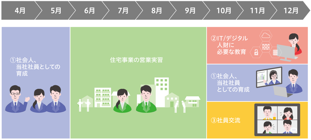 基礎(chǔ)教育としての「①社會人、當(dāng)社社員としての教育」。これからのIT/デジタル人財に必要とされるスキルを再定義した専門教育としての「②IT/デジタル人財に必要な教育」。テレワークにおいても社員間のコミュニケーション量を増やし、多くの先輩社員から価値観や仕事に対する姿勢を生の聲から吸収するための「③社員交流」。以上、3つのカテゴリと全社的に実施される「住宅事業(yè)の営業(yè)実習(xí)」を加えて新入社員教育を?qū)g施しています。これらの各種教育は、教育を?qū)g施する側(cè)と受けた側(cè)のフィードバックを隨時行っており、毎年継続的な改善につなげられるよう運用しています。(図3)