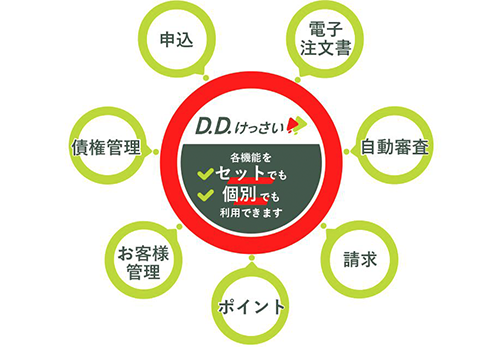 D.D.けっさいは、申込?自動審査?債権管理?請求?お客さま管理?ポイントシステム?電子注文書を、それぞれ自由に組み合わせて利用いただくことが可能なシステムです。(図1)