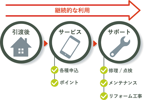 物件引き渡し後のさまざまなシーンでD.D.けっさいを通して継続的にお客さまとの接點を持つことで、お客さま満足度の向上につなげます。(図2)