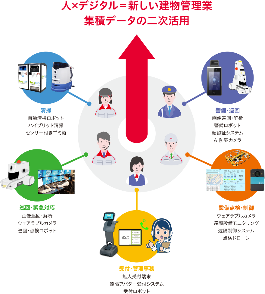 當社グループは省力?省人からさらに一歩進んで、各種IoT機器から得られるデータを集積?分析し、管理業務の數値化?見える化を図ることで、お客さまにも透明性と付加価値の高い管理業務を提供していきます。