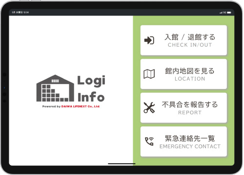 物流倉庫においてタブレット端末で現地スタッフとの通話から館內資料閲覧、入退館管理などをペーパーレスでスマートに行うことができる受付アプリを內製開発しました。
