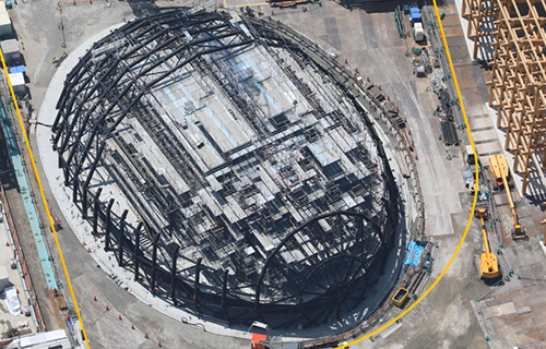 2次元図面での施工計畫は非常に困難なため、DXを用いた計畫および施工が必須となりました。特にタマゴ狀の外殻構造體にかかわる足場計畫、鉄骨建て方、軀體計測の立案計畫を重點項目としました。BIM、3D座標計測を用い精度の高い計畫が安全、品質確保、労務削減を実現可能としました。外部はボロノイ狀膜であり、稜線を綺麗にみせるためには正確な下地鉄骨設置が必須となったため意匠の面においても強いこだわりを持ちました。