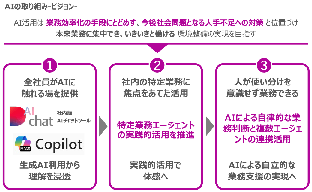 AI近年、AIの進化により、一人ひとりの働き方が変わりつつあります。以前はシステム化が困難だった業務も、AIの進歩により効率化が可能となり、成果を上げる事例が増えています。當社ではこの変化を活かし、従業員が本來取り組むべき業務に集中できる環境整備を行っています。今後、働き手が減少することが予想される中、AI活用は、「いかに効率的かつ従業員がいきいきと働ける環境提供をできるか?」という課題解決に非常に大きな意味を持ちます。そのため、まずは全従業員がAIに觸れる場を創り、理解の浸透を訴求することから始めました。現在は社內の特定業務に焦點をあてた活用シーンへ展開中です。さらには、人が使い分けを意識せずとも必要な業務をAIが判斷し、自律的に動作する世界観を見據えて企畫を進めています。