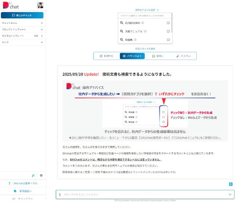 2023年に社內で利用を開始した生成AIサービス(DAIchat)に、新たに社內規程やマニュアルを検索できる機能をリリースしました。また、ハルシネーション(*1)対策や情報の鮮度を維持するための対策を併せて検討しました。