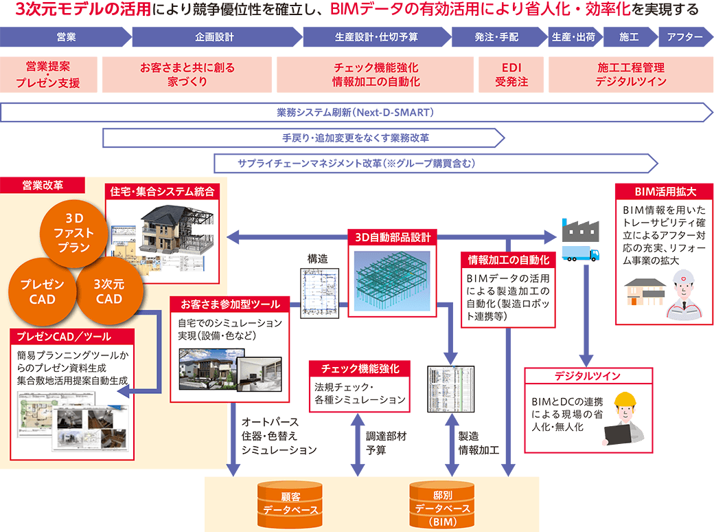 BIMによる事業DXの実現に向けて住宅系事業では、BIMデータを顧客情報およびものづくり情報と一元化することで、BIMデータの高度活用と競爭優位性の確立を目指しています。BIM導入前は、仕様データとCADデータとの整合性をとるために「同期処理」が必要でしたが、現在はBIM対応の3次元CAD(Revit)をベースに3Dモデルと仕様データを統合したBIMデータとして運用活用しています。
