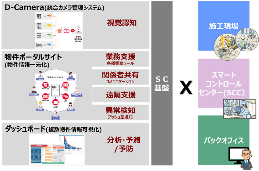 當社では、住宅系事業本部において施工擔當者全員にスマートフォン等を配布し、2021年5月より施工現場のスマートコントロール環境の整備を進め、施工現場での定點カメラ(「D-Camera」)の全棟設置、「物件ポータルサイト」による施工現場ごとの情報一元化?関係者間共有、「ダッシュボード」による過去物件を含む複數現場の見える化?分析を行って、技術者の生産性向上の取り組みを行っています。(図7)