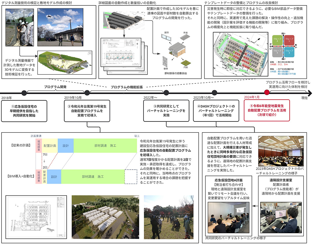 2019年中部?関東?東北に甚大な被害を與えた臺風19號では、自動配置プログラムを初導入した応急仮設住宅の配置計畫を行い、2日間での配置承認取得を達成しました。その後も継続的にプログラムの改良とデータ整備を実施し、敷地測量技術の検証や建物の図面作成の自動化も共同研究テーマとして、配置計畫前後のプロセス改善にも取り組んできました。また、遠隔で応急仮設住宅の計畫を支援するバーチャルトレーニングを実施し、災害発生に備えた支援體制の構築を模索してきました。