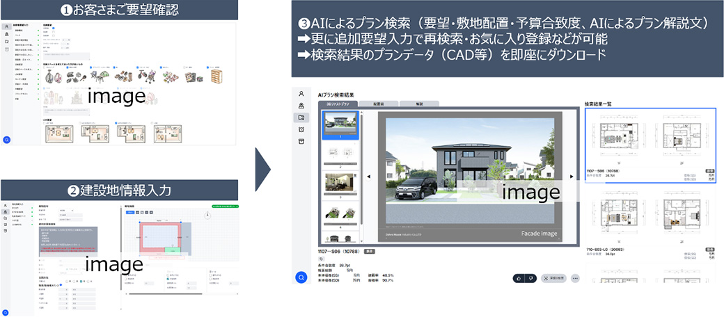 お客さまのご要望?建設地の配置合致度をAIが判斷し、2000プランを超える規格住宅?セミオーダー住宅「Smart Made Housing.」のプランの中から合致度順に選定します。選定理由やプランの特長はAIがお客様のご要望観點から解説を生成。追加要望(フリーテキスト)による絞り込みや追加検索も可能です。これらにより、2000以上のプランから「お客様に合うベストプラン」をスピーディかつ納得度高くご提案することができます。