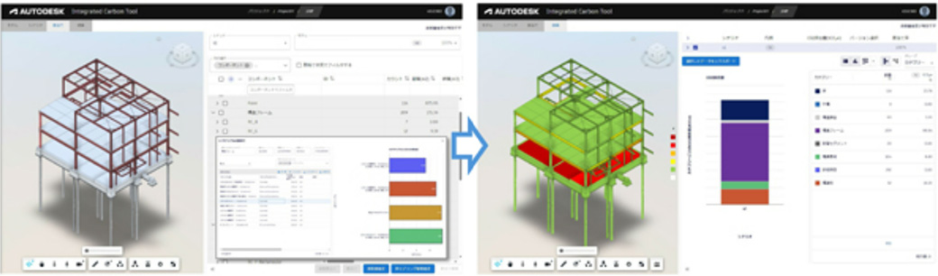 設(shè)計者が、BIMモデルをもとに部材の數(shù)量や材料情報を取り込み、BIMモデルで再現(xiàn)しない部材も含めたCO?排出量を自動算定できるようにすることで、効率的かつ低炭素な設(shè)計を可能としました。