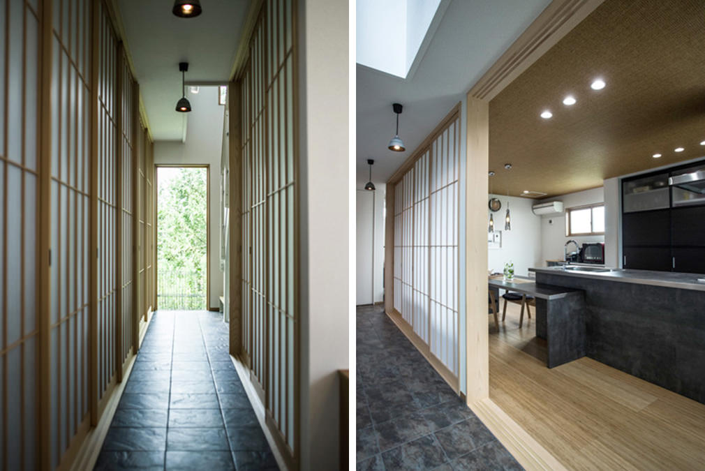 左右に並べた10枚の障子。正面には、北側の緑の景色を切り抜いたピクチャーウインドウ。足元には玄関から続く黒いタイルの廊下。非日常的な不思議な空間を暮らしの軸としました。左手の障子を開くとダイニング?キッチン、右手を開放すると和室が現れ、1階全體が大きな一つの部屋となります。