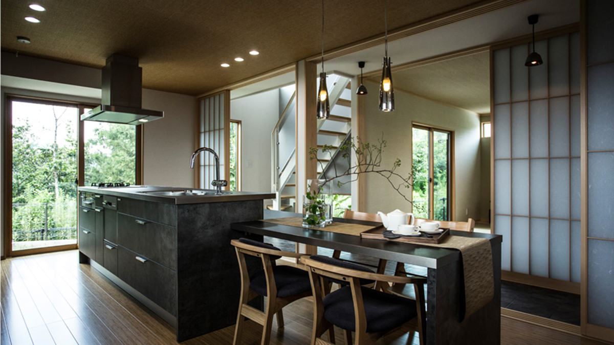 料理を趣味とし、食べることを大切にしているご家族。キッチンと一體型のテーブルを1階の中心に據え、そこから住まい全體を計畫していきました。障子を開放すると和室や階段ホールと空間がつながり、家事をしながら子どもたちの姿を確認することができます。左手にはBBQも楽しめるテラスを設けています。