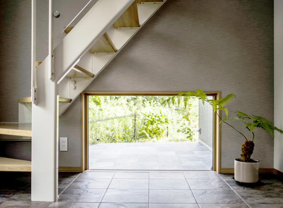 北側に設けた階段が閉鎖的にならないようスケルトン階段とすることで、階段下にも遊び心のある空間が生まれました。地窓の向こうにはタイル張りのテラス。自然光が足元を明るく照らします。