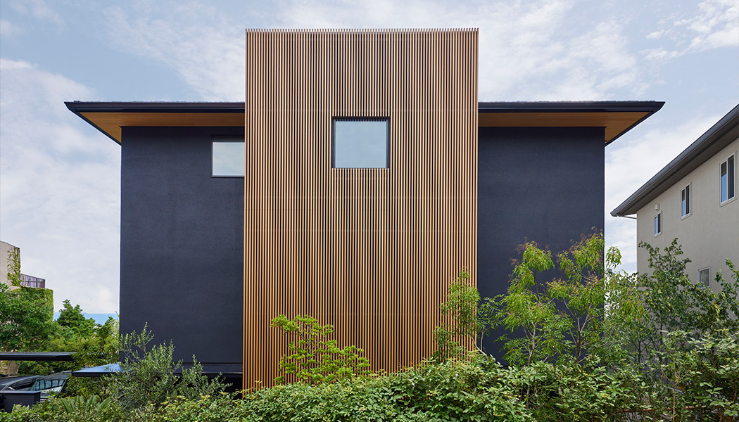 外観:山側(cè)のファサード面。墨色の外壁と白木色の木目のコントラストで和を表現(xiàn)した。