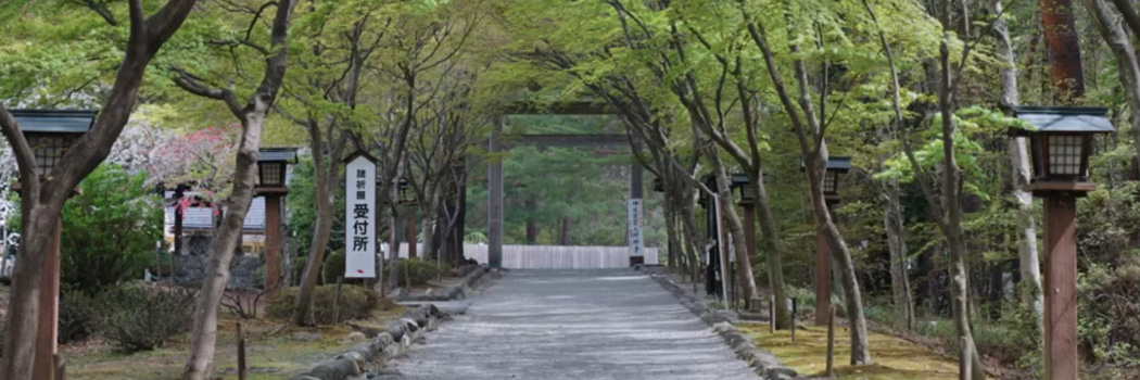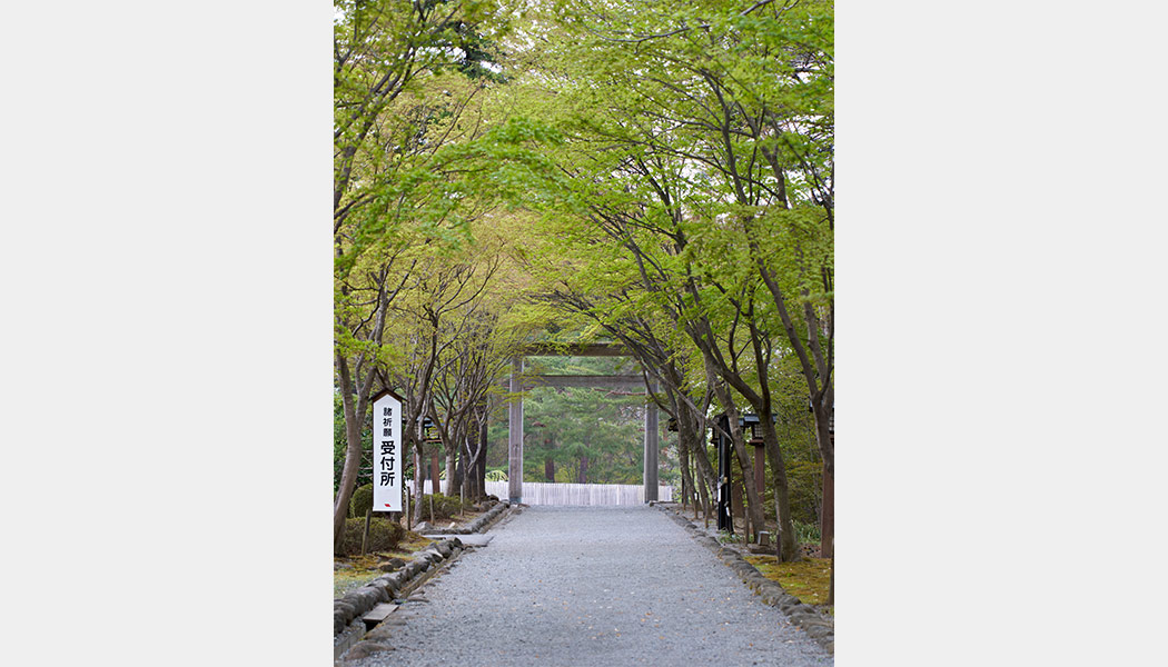 參道:新緑に覆われた參道。參詣する人々の心が洗われるよう。