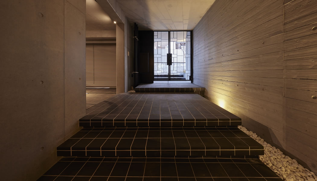アプローチ:道路から玄関までのドラマティックなアプローチ。玄関に向かってゆっくりと下がっていく。