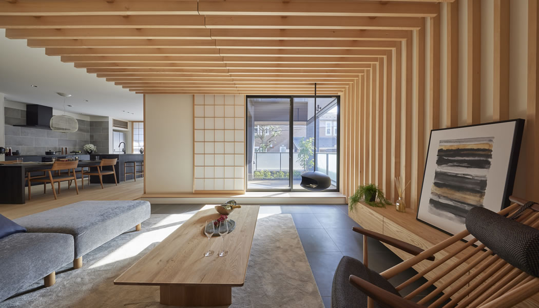 リビング:リビングの天井格子。壁面との連続が空間にインパクトを與えている。