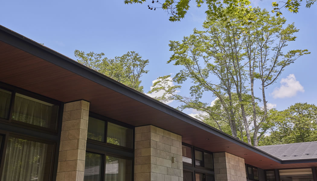 軒下空間:深い軒の下、広がる空に心が解き放たれる。外壁の凹凸で陰影を出し、軒先の水平ラインで空や緑を切り取る。