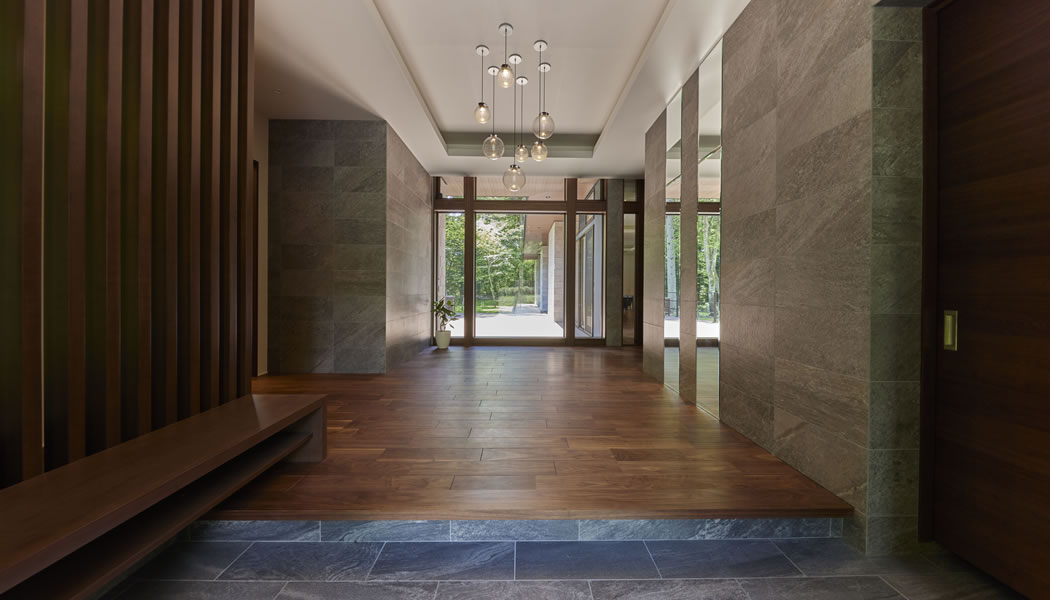 エントランスホール:玄関扉を開ければ、奧へ、その先の緑へ、視線は抜けていく。ピクチャーウィンドウでおもてなしの空間を演出。