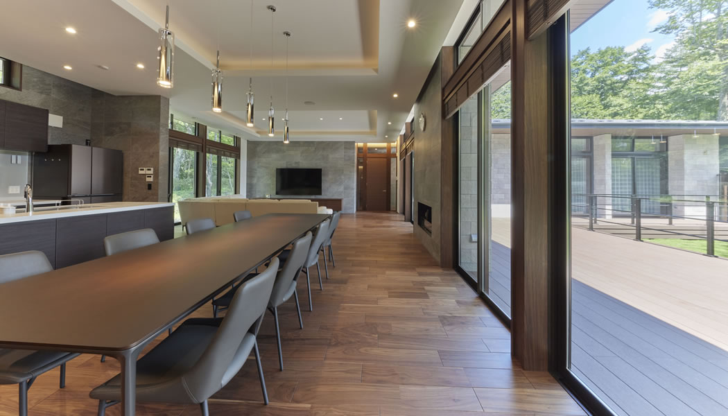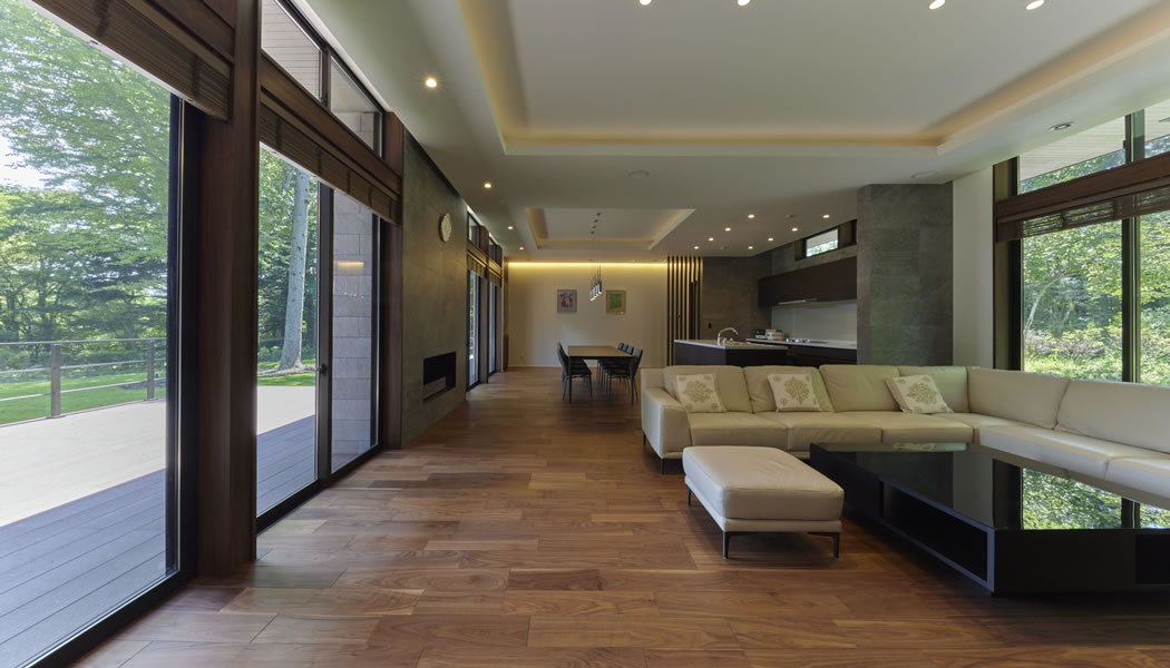 大開口:緑と溶け合う空間が、都心の喧騒を忘れさせる。自然とのつながりを感じられる連続窓。