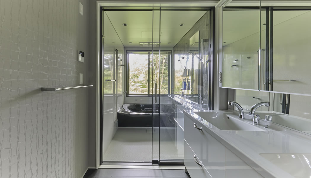 バスルーム:外の潤いを愉しみながら、より深い癒しを。大きなガラス窓が開放的な浴室。緑が映えるように無機(jī)質(zhì)で透明感のある素材を採用。