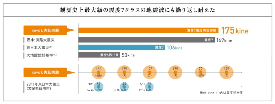 また國立研究開発法人防災科學技術研究所の実大三次元震動破壊実験施設「E-ディフェンス」(愛稱)にて、実証実験をおこなったところ、D-NΣQSTを採用のxevoΣは、震度7相當の地震が4回連続で起こっても、新築時の耐震性能を維持することを実証。
