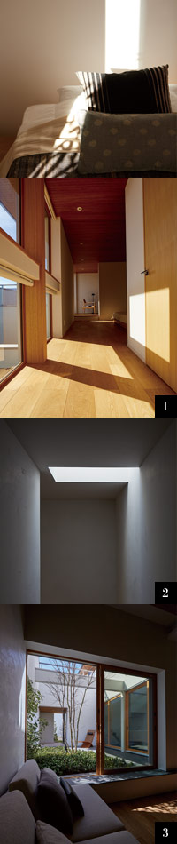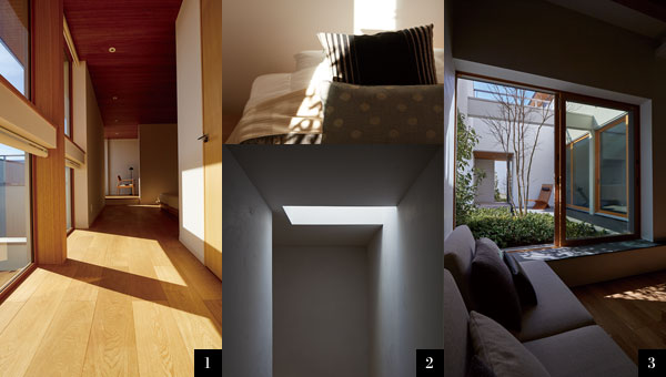 1. 陰影のコントラストを強調し空間の奧行きを演出。 2. 壁に窓をつくらず、天窓を設けて一筋の光を入れる。 3. 空間を木漏れ日で満たすために、植栽と窓を配する。