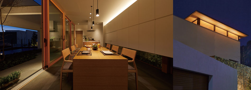「庭屋一如」という考え方がある。自然と空間をひとつながりとし四季折々の表情を暮らしに招き入れることは、家の重要な要素のひとつ。手に屆きそうな庭の木々、遠くに見える風景、刻々と変わる空模様の移ろい、ここにあるのはそんな自然を感じる贅沢、光と影質感と形狀、內と外をつなげるディティールにこだわって、住む人が美しく暮らせる家づくりをここから。