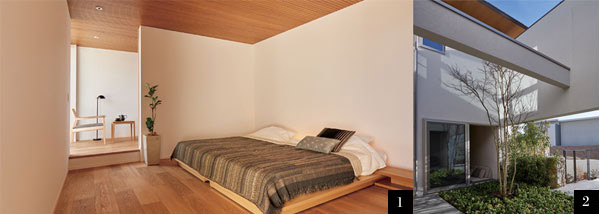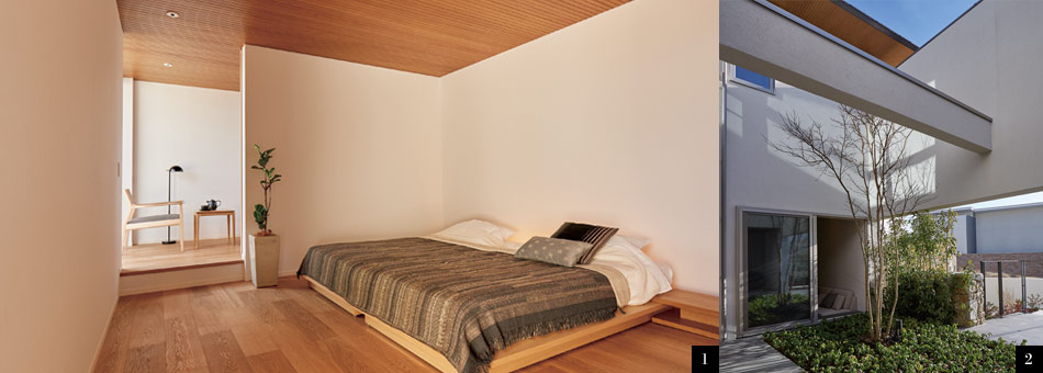 1. 壁で視線や光を遮り、囲われることによる落ち著きを創出。 2. 壁に光を反射させることで、室內に明るさを導いている。