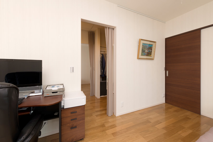 間にウォークインクローゼットを挾み、扉がなくつながっているご夫妻の寢室。「萬一の時(shí)に聲が聞こえるように配慮してくれたのだと思います。寢室とトイレが近いのも便利です」とNさま