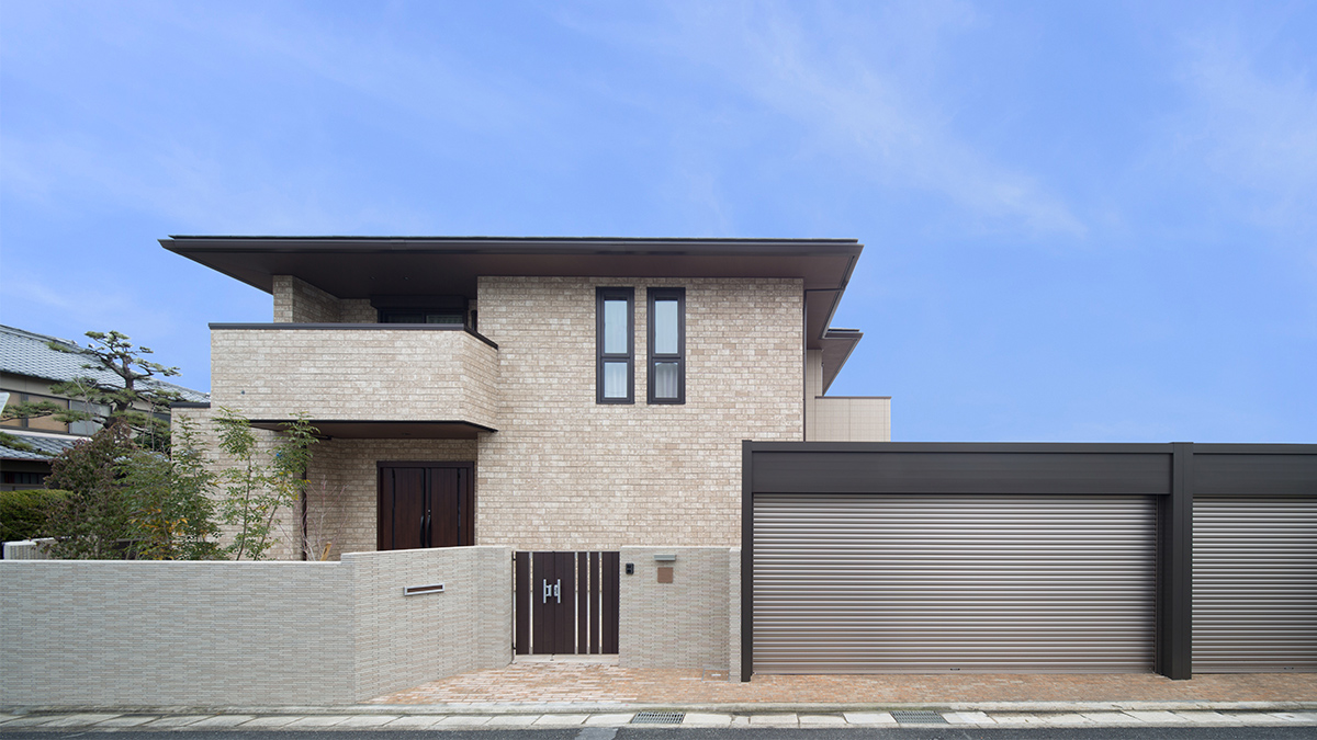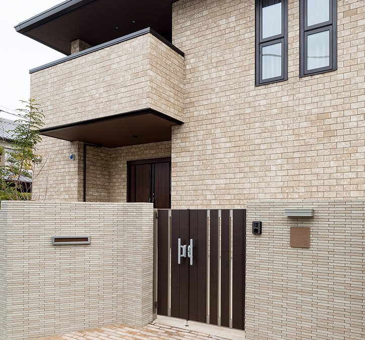 割肌タイル外壁の重厚感漂うたたずまい。やわらかな色合いの割肌が織りなす陰影感が優雅な印象を放ちます