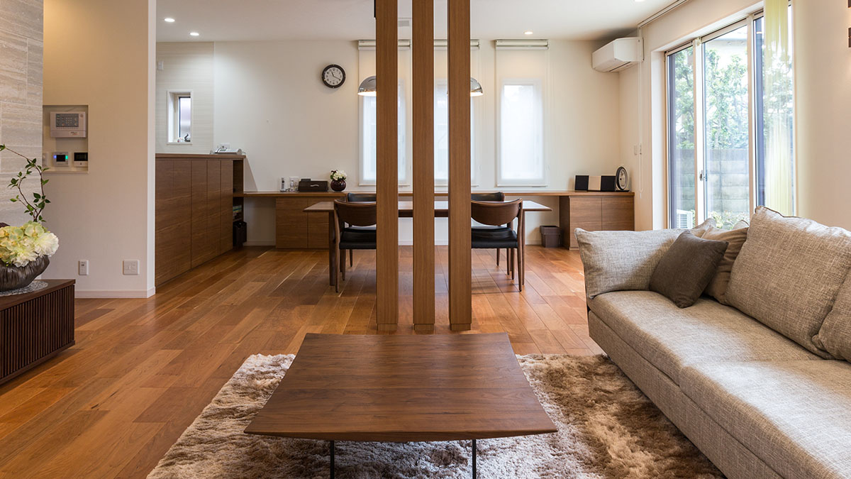 天然木の溫もり漂うブラックチェリーの床と、大理石調タイルの壁が調和した上質なリビング。ゆったりとくつろげるので、ご家族が自然に集まるようになり、會話も増えたそうです
