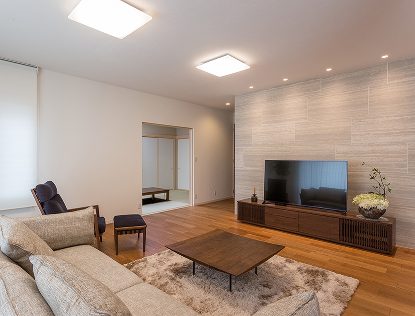 天然木フローリングに大理石調タイルの壁が気品高く映えるリビング