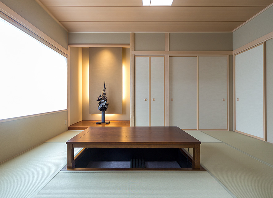 和室には掘り炬燵をしつらえて、ほっこりできる憩いの間に。床の間の壁の手前に櫛引塗りの裝飾壁をあしらい、間接照明で彩ったやわらかな光の演出も素敵です