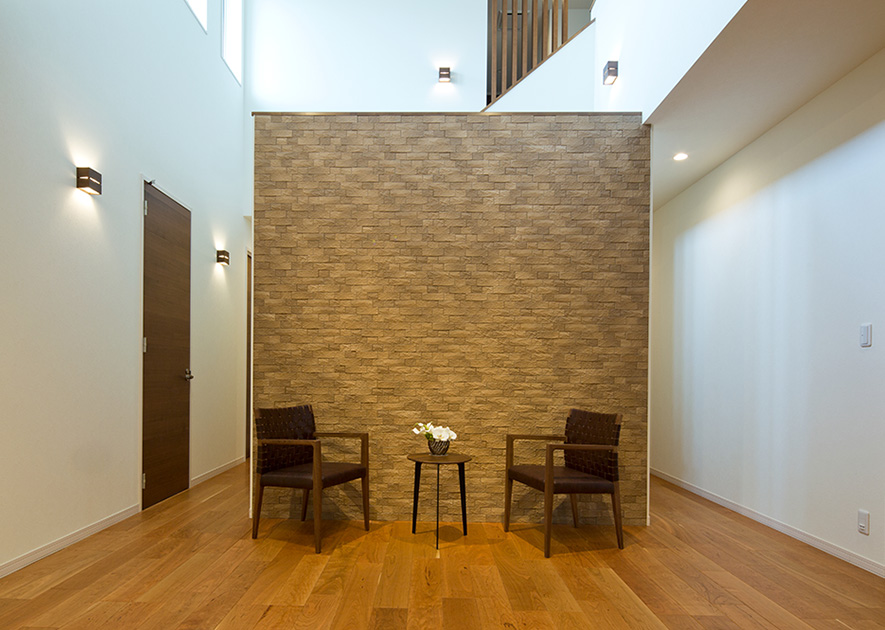 訪れるゲストが目を見張る吹き抜けの玄関ホール。ブラウンタイルの大壁が圧倒的な存在感を放っています。インテリアに飾った椅子は、來客との応対にも使えます